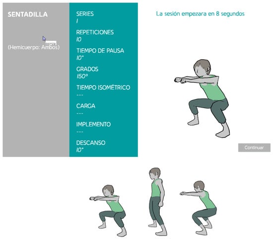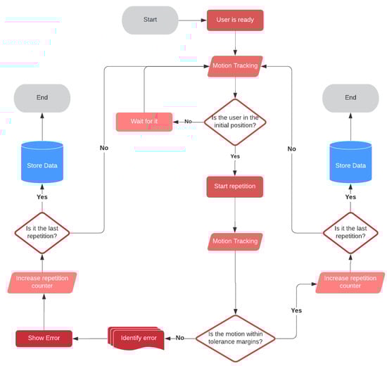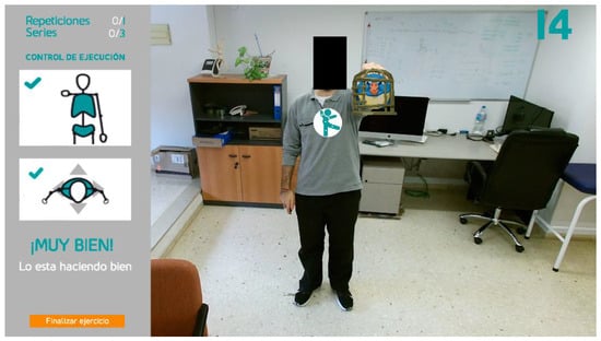 Figure 15. By means of a gesture-based command, the user lets the system know that they are ready to perform the exercise, and the system begins to monitor the movement, particularly the joints and segments involved in the exercise. The system waits until the user’s position is recognized as the correct one to begin the first repetition of the exercise. When the user starts to execute this first repetition, the system monitors their movements and checks in real time that they meet the control rules defined for the exercise, which is usually based on tolerance margins. If an error is detected, the user is informed through visual feedback, so that they can try to correct it in the next repetition. This process continues until all scheduled repetitions are completed, after which the achievements are stored in a database.