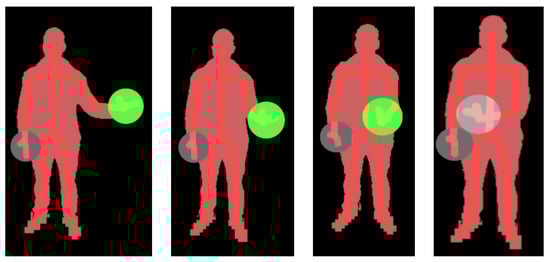 Figure 12, left). When one of the hand joints is detected in a valid starting position, the color of the circle representing that hand changes to green to inform the user that the starting position has been validated. As long as the user moves the hand along the