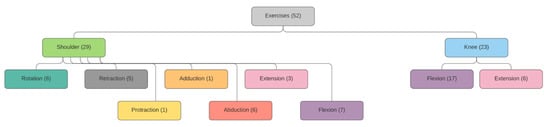 Figure 14 shows the set of exercises implemented, which have been divided into shoulder and knee activities. Since the shoulder has more degrees of freedom than the knee, the number of exercises of the former is higher than that of the second. They were chosen according to suggestions made by the medical team, with the aim of addressing the most common locomotor problems in old age, and thus, of improving the quality of life in the elderly. An example illustrating how a user interacts with the system is shown in [