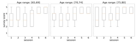 Each participant took part in six sessions over a 15-day stay in a center specialized in caring for the elderly, completing the same physical routine and the same survey in each session. Once the routine had been performed, participants were asked to fill out the survey in order to assess whether their perception of the system changed as they faced it every time.