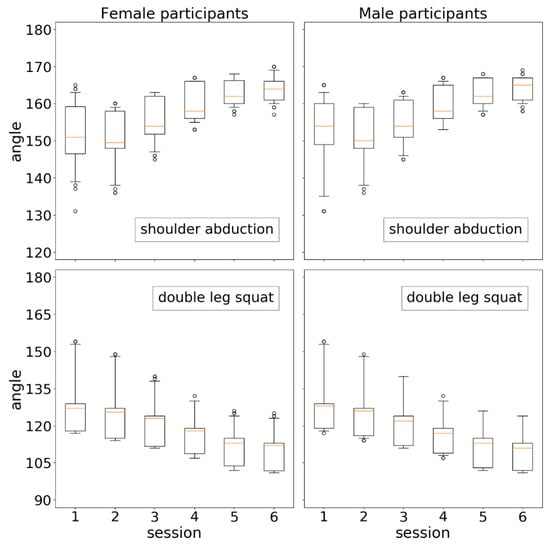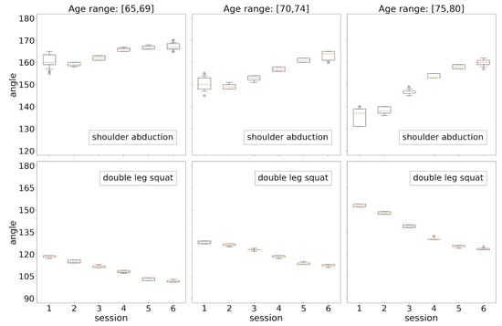 In the case of shoulder abduction, the angle of the arm with respect to the body was measured in each repetition. The higher the angle, the better the performance. In the case of the double leg squat, the angle between the thigh and the lower leg was measured in each repetition. The correct range of motion is from 180º (upright position) to 90º (the thighs are parallel to the floor). Thus, unlike the shoulder exercise, the lower the angle, the better the performance. The average angle over all repetitions of an exercise performed by a participant in one session was considered the performance measure of that participant in that session.