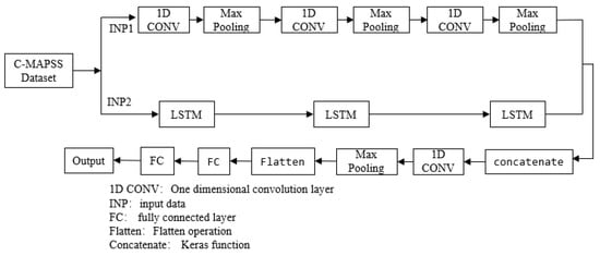 The life prediction model 1-FCLCNN-LSTM proposed in this paper adopts the idea of classification and parallel processing; 1-FCLCNN and LSTM network extract spatio-temporal features separately, and the two types of feature are fused and then input to the one-dimensional convolutional neural network and fully connected layer. Specifically, first, by preprocessing the C-MAPSS data set, the data are standardized and divided into two input parts: INP1 and INP2. These two parts are input to the 1-FCLCNN and the LSTM neural network. Among them, the 1-FCLCNN is used to extract the spatial feature of the data set. At the same time, the LSTM is adopted to extract the time series feature of the data set. After the feature extraction, the algorithm 1 is applied to fuse the two types of feature and then inputs them into one-dimensional convolutional neural network. Finally, the data through the pooling layer and fully connected layer, is delt with algorithm 2, and the predicted RUL result is obtained. The overall framework of the model is shown in Figure 5.