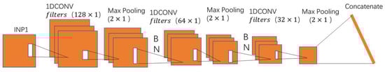 The input of the 1-FCLCNN path is INP1. There are three 1D-CNN layers, which are used to extract the spatial features. The stacked CNN [29] layers are parsed by three max pooling layers. The first 1D-CNN layers consist of 128 filters (). The second consist of 64 filters (), and the third consist of 32 filters (). The convolution kernel size of the three 1D-CNN layers is the same (). “ReLU” activation function(formula 3) is used for the 1D-CNN layers. The Settings of the max pooling layers:. The batch normalization speeds convergence and controls overfitting after each max pooling layer. The 1-FCLCNN path can be used with or without dropout, making the network less sensitive to initial weights. The detailed architecture is shown in Figure 6.