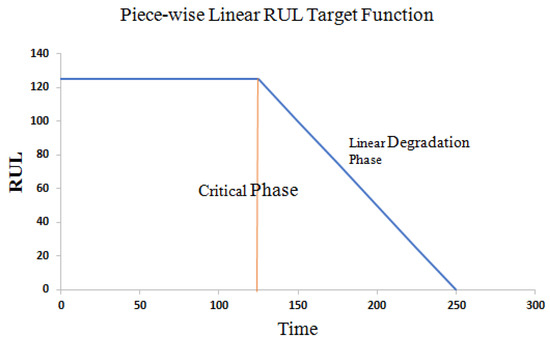 In the neural network model, we need to get the corresponding output according to the input data. The state of the system at each time step and the specific information of the target RUL are based on the physical model and are difficult to determine. To solve this problem, different solutions have been proposed. One solution is to simply allocate the required output as the actual time remaining before a functional failure, but at the same time the state of the system will decline linearly [36]. Another option is to obtain the desired output value based on the appropriate degradation model. Referring to the current literature, this paper adopts piece-wise linear degradation model to determine the target RUL [37,38,39,40]. Piece-wise linear regression model can prevent the algorithm from overestimating RUL. For an engine, equipment can be considered healthy during its initial period. The degradation process will be obvious before the whole equipment runs for a period of time or is used by a certain extent, that is, near the end of the life of the equipment. Set the normal working state of the device to a constant value, and the RUL of the device will drop linearly with time after a certain period of time. This model limits the maximum value of RUL, which is determined by the observed data in the degradation stage. The maximum RUL value of the data set observed from the degradation phase of the experiment is set to 125, and the part exceeding 125 is uniformly specified as 125. When the critical period is reached, RUL decreases linearly as the running period increases. The Piece-wise Linear RUL Target Function is shown in Figure 9.