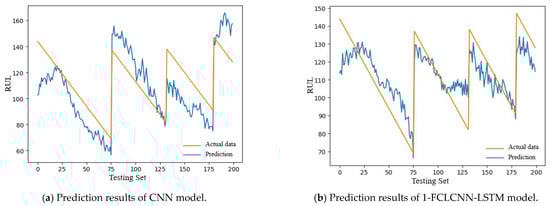 The test sets of FD001 and FD003 were input into the trained CNN and 1-FCLCNN-LSTM models to obtain the prediction results, which are shown in Figure 14 and Figure 15, respectively.