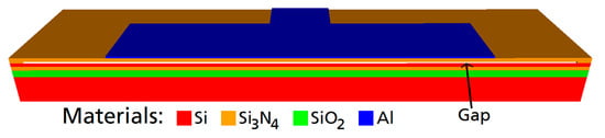 First, the CMUT was designed. The objective was a center frequency of 2 MHz in water. An additional constraint was a broad bandwidth to enable effective communication as well as a high output pressure. Using the finite element software OnScale (formerly PZFlex) [22], a standard cell design of a rectangular Si3N4 membrane with an embossed aluminum electrode was modified (see Figure 1.). A single CMUT cell was simulated exploiting two symmetry axes. Meshing was applied with 20 finite elements per 14 µm (a half-width of the aluminum electrode) with a minimum number of 4 elements per dimension within each material layer. The material parameters used in the simulation can be found in Table 1. The properties of the silicone were determined experimentally, those for PEEK were found in the work of Fitch et al. [23]. The other materials are included in the OnScale database [22].