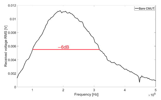 Finally, transmission measurements were performed in immersion. For a DC voltage of 60 V and an AC voltage signal of 10 V (burst count 20), an uncoated CMUT chip (transmitter) and a coated CMUT chip (receiver) were mounted at a distance of 83 mm.