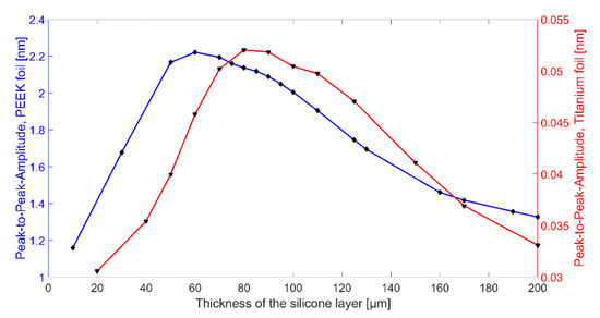 Figure 6. Simulated dynamic displacement of a polyether ether ketone (PEEK) foil (thickness 25 µm, blue curve) or a titanium foil (thickness 32 µm, blue curve) on top of a single CMUT cell with a silicone layer of different thickness, excited with 60 VDC and a single sinusoidal burst at 2 MHz of 15 VAC.