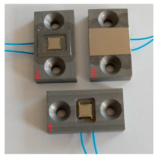 Figure 7. Setups validated in transmission experiments: (1) uncoated CMUT, (2) CMUT with silicone (t = 170 µm) and PEEK (t = 25 µm), (3) CMUT with silicone (t = 170 µm) and titanium (t = 32 µm).