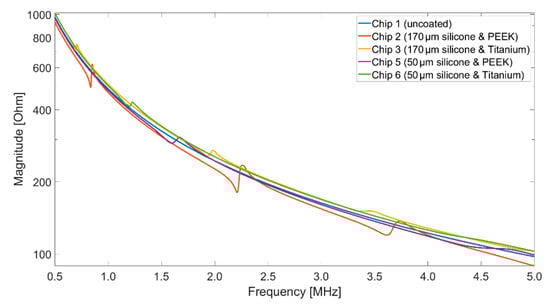 In the first step, the impedance spectrum of the uncoated CMUT transducer was measured in air at a bias voltage of 40 VDC. In the frequency range between 500 kHz and 13 MHz (limited due to the setup used), no resonance was found for the uncoated CMUT array, as it was already in collapse mode. Due to the additional layers applied on the CMUT membrane, the collapse voltage was higher for the encapsulated CMUT chips, which is why the result shown in Figure 8 for the uncoated chip was still at a bias voltage of 40 VDC for better comparability. After covering the CMUT array with silicone and PEEK or silicone and titanium, the measurement was repeated. The results are shown in Figure 8. Although the global behavior caused by the static capacitance of the array (CS = 10.2 nF) did not change significantly, several resonances could be seen in the curves of Chip 2 and Chip 3. Chip 2 shows minima at 837 kHz, 2.21 MHz, 3.62 MHz, and 5.06 MHz. Chip 3 shows minima at 696 kHz, 1.93 MHz, and 3.38 MHz. Chip 5 shows a minimum at 1.59 MHz, Chip 6 shows a minimum at 1.20 MHz. The impedance measurements thus show that the CMUTs were not destroyed during the coating process and that additional resonance was induced by the coating.