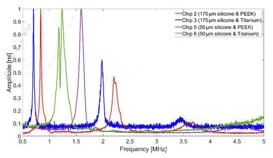 In the case of the CMUT chip 2 (coated with 170 µm silicone and PEEK), the vibrometry measurement in air showed resonances at 838 kHz, 2.20 MHz, and 3.69 MHz. Chip 3 (silicone and titanium) had resonance at 703 kHz, 1.98 MHz, and 3.5 MHz. Reducing the thickness of the silicone layer to approx. 50 µm, lead to a single resonance peak at 1.59 MHz for Chip 5 and two peaks at 1.18 MHz and 1.23 MHz for Chip 6. The measured spectra are shown in Figure 9. This corresponded well with the measurements with the impedance analyzer.