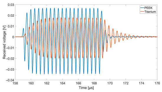 Figure 10. Received voltage signal at 2 MHz for coatings with 170 µm thick silicone and PEEK with a thickness of 25 µm as well as with 170 µm thick silicone with a titanium foil of 32 µm thickness.