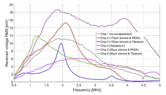 Figure 10 shows an example of the received signals at an excitation frequency of 2 MHz for the receiving chip coated with a layer of silicone (thickness 170 µm) and a foil of PEEK or titanium.