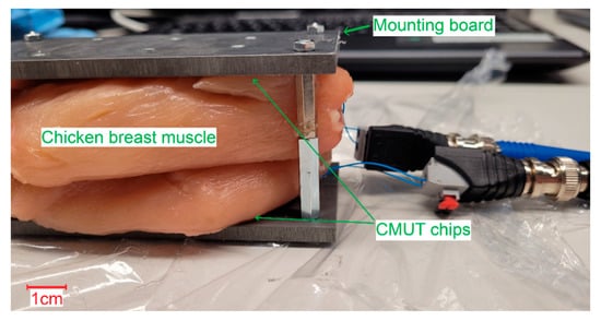 The experiment described below shows the functionality of the encapsulated ultrasound transducers in tissue. Using CMUT Chip 2 for transmitting and CMUT Chip 5 for receiving, first, ex vivo measurements were performed on chicken breast muscle (fillet) of 35 mm and 60 mm thickness. Multiple layers of chicken breast muscle were stacked on top of each other and bonded with ultrasonic gel to prevent transmission from being disrupted by trapped air. A photo of the experimental setup of the transmission path is shown in Figure 12. The CMUT chips were attached to the inner surface of the two boards. Compared to the previous transmit experiments (see Figure 5), the setup remained unchanged, only the Fluorinert was replaced by chicken breast muscle.