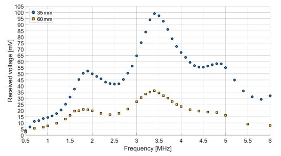 The resulting receiving spectra of the ex vivo measurements for distances of 35 mm and 60 mm are shown in Figure 14. The main resonance frequency shifted to 3.4 MHz. Further maxima were found at 1.9 MHz and 4.9 MHz.