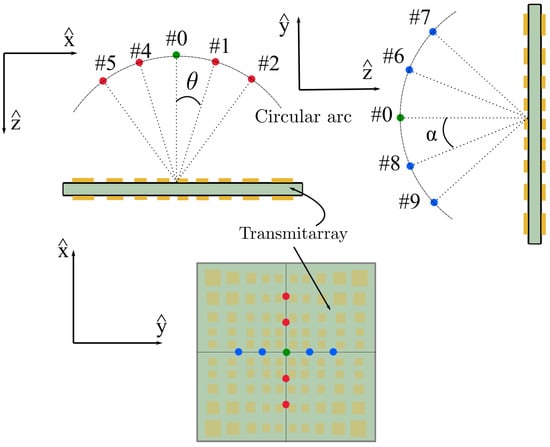 The distance between adjacent feeds is defined by the angle and (see Figure 1) for the cut and , respectively. Setting the center of the coordinates at the geometric center of the transmitarray, the central feed is at mm, and the other feeds are located at: