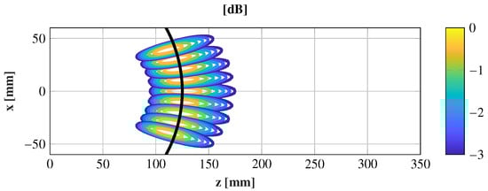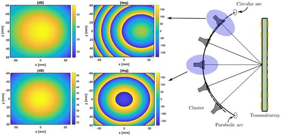 A popular approach in NFF design is the conjugate phase (CP) used to adjust the phase of the antenna elements such that the radiated wave is in phase at a single focal point [,]. However, when dealing with multi-focusing solutions, other approaches may be used. A classical solution for planar arrays is to use optimization techniques to minimize a cost function with requirements for all the spots simultaneously; nonetheless, the increase of the computational cost regarding the CP and the complexity and high insertion losses of the feeding networks makes this approach unsuitable in the millimeter band.
