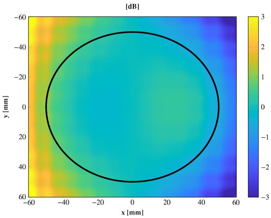 This cluster feeds a transmitarray made up of 576 elements on a regular gird of elements with a periodicity of mm in both the and direction. The equivalent aperture of the transmitarray is mm () at the central frequency, 28 GHz. According to this configuration and using a standard gain horn of 15 dBi, the incident field is analyzed at different positions to evaluate their differences. In particular, the central position and the extreme feed are compared, which is the worst case. The comparison is carried out with a full-wave simulation using CST Microwave Studio []. The incident field at 28 GHz is obtained at these two positions, and the results are shown in Figure 2. Both incident fields behave similarly, and the difference is lower than 1 dB in an area of radius 50 mm (see Figure 3). These differences increase on the transmitarray edge due to the projection of the incident field on the transmitarray surface. The incident phase changes since it only depends on the phase center location. Hence, if a transmitarray is designed properly to focus the near-field on a given spot, with a single feed, it can be assumed that locating different feeds according to (Figure 1), the different incoming fields may be focused on different spots regarding the incident progressive phase variations.