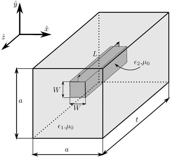 The proposed cell is made of poly-lactic acid (PLA) ( and tan at 40 GHz) [], acting as a dielectric host of an air gap inclusion []. The size of the inclusion controls G; therefore, it controls the of the cell. The geometry of the dielectric cell, both the host and air gap inclusion, is a square prism of dimensions and variable dimensions , respectively, as Figure 5 depicts. The ratio between the air and dielectric material can be computed as: