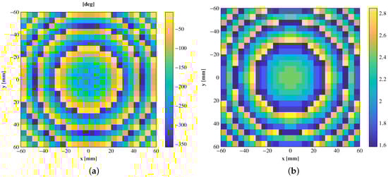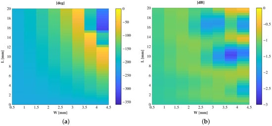 The study was carried out at a central frequency of 28 GHz. The amplitude and phase response of the transmission coefficients of the cell are shown in Figure 6 as a function of the air gap dimensions for normal incidence and 28 GHz. The phase response entirely covers a range, and the transmission losses are lower than dB in more than of the cells.