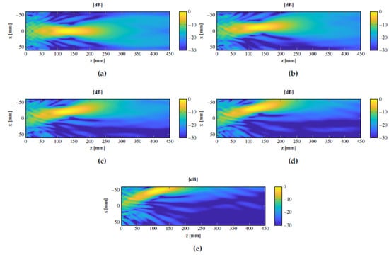 Normalized simulated amplitude electric field on the plane for several positions of the feed. (a) , (b) , (c) , (d) , and (e)