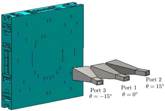 In this approach, the horn antennas are supposed to work in close, but different carriers, having a high isolation between horns. However, the isolation was also computed assuming the same frequency carrier for all the feeds, which can be considered the worst case. Figure 10 shows the setup with CST Microwave Studio to analyze the S parameters of the horn antennas, considering the lens and three horns placed at (Port 1), (Port 2), and (Port 3). The magnitude of , , and shows that the three horn antennas are matched since this parameter is below dB from 26 to 30 GHz (see Figure 11a). Additionally, the magnitudes of , ( = ), and are shown in Figure 11b, and the level is almost below dB in the entire band. These results show a high isolation between adjacent horn antennas working in the same frequency carrier. Note that the coupling between the edge horn antennas is slightly higher because their tilting angle is the same for both, but of the opposite sign (). Therefore, each edge horn antenna suffers from the specular reflection produced by the lens surface and the other edge horn antenna.