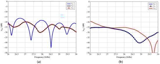 S parameters of the three horn antennas (a) , , and and (b) , , and according to the port definition given in Figure 10.