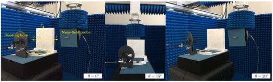 The proposed planar dielectric lens made up of 576 square prism cells was manufactured and measured at the facilities at the University of Oviedo. The lens was manufactured with a 3D printing technique using the printer Ultimaker 3 and measured in a planar acquisition range. The setup in the planar range is depicted in Figure 12. A vector network analyzer PNA-X from Keysight was connected to the feeding horn, a standard gain horn of 15 dBi (Flann 22240-15), and a second port was connected to an open-ended Ka-band wave-guide used as a near-field probe. Due to the limitations of the facilities, only one horn was used in the measurements. However, the structure bearing the horn antenna enables moving the feed into an arc of radius 100 mm, thus placing the horn antenna on the different positions of the cluster. The measurements were performed at three different feed positions () in a bandwidth of 4 GHz, from 26 to 30 GHz, evaluating the electric field on the horizontal plane .