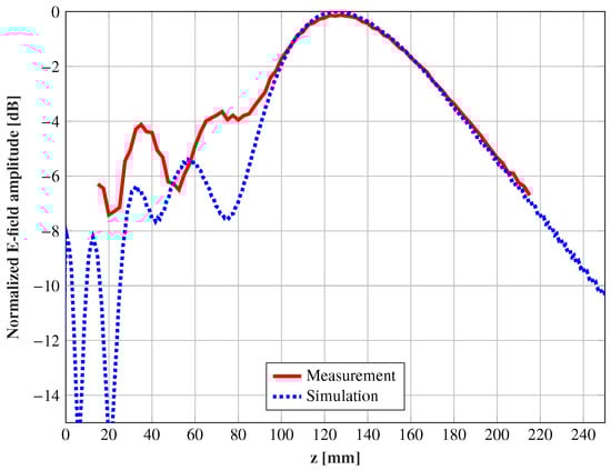 Comparison between the simulations and measurements of the normalized amplitude (dB) of the electric field along the propagation direction and at 28 GHz with the feed .