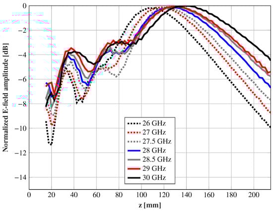 The in-band response is analyzed from 26 to 30 GHz. In Figure 15, the normalized electric field amplitude through the propagation direction and is shown for the central spot and different frequencies. The measurements presented an extremely stable behavior from to 29 GHz, keeping a similar depth-of-focus, and the maximum barely shifted it position. At the frequencies out of this range, the maximum of the field was displaced, whilst the depth-of-focus was enlarged or shortened, regarding the frequency. These results show a great in-band response compared with transmitarrays based on resonant elements.