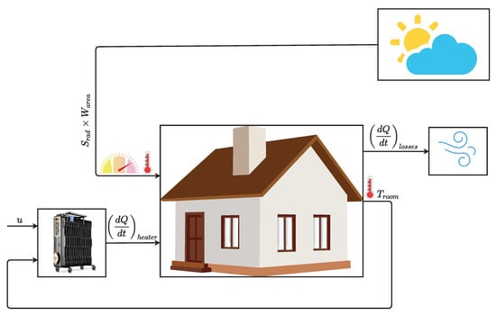 Figure 1 is a visual representation of the model adopted in this paper. There are two primary sources of heat (heater and solar radiation) and one source of losses. At the center is the building or room whose temperature should be controlled. This room acts as an integrator, as stated by the equation that computes the rate of change of its internal temperature , meaning that the heat coming from the heating sources will be accumulated until reaching a thermal balance between input and output heat sources. Concerning the input sources, there is a standard electric heater, which also acts like an integrator, heating until the maximum average rating value () with some time constant with respect to the control signal applied. There is also the contribution from the incident solar radiation (). The temperature losses result from heat exchanges with the outdoor environment and depend on the building insulation type. In this study, a standard value for the equivalent thermal resistance is adopted, to make the results as generic and representative as possible [27].