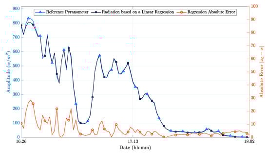 Figure 4 shows an example of the measurements carried out, obtained in this case at the end of the winter season between 4:30 PM and 6:00 PM. We chose this time-frame to have a more significant variation of incident solar radiation, since the sunset at the end of the season is typically near 6:00 PM. It was a cloudy day, which further contributed to the appearance of significant solar intensity variations, allowing us to obtain more significant results. After calibration, it was possible to obtain an average absolute error of 5.7 W/m and an average relative error of 0.1%.