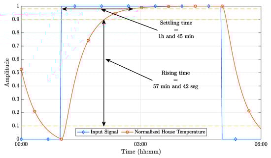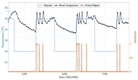 This section presents the results obtained from the computer simulation of the implemented control system. These results were obtained using a combined simulation environment using MATLAB and the Simulink toolbox. The dynamic behavior of the house model was implemented using the Simulink toolbox, based on the continuous-time model derived from the thermodynamic equations presented in Section 3. The environment conditions were obtained from a dataset provided by [35], which makes the simulation close to a real implementation.