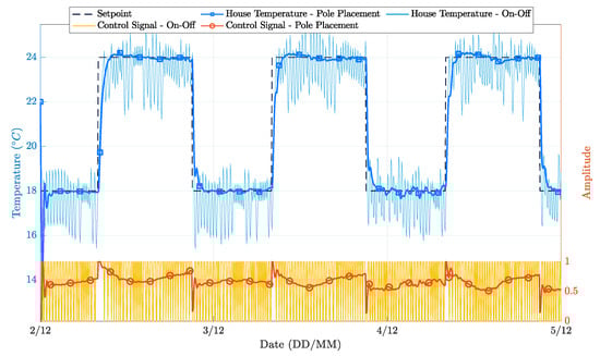Table 1 and Table 2 present quantitative results regarding the controllers’ performance. More specifically, Table 1 presents the Mean Squared Error (MSE) and Normalized Mean Squared Error (NMSE) for the three approaches. The NMSE formulation adopted in this paper is . It is possible to observe that the PP controllers show an MSE reduction of 42% and 52% with respect to the on-off controller. Moreover, the extended PP controller exhibits a 17% MSE reduction with respect to the simpler one.