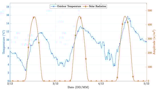 The controller’s performance was evaluated for a three-day time window, with clear sunny days and average temperatures typical of the winter season. Figure 7 depicts the behavior of the external environmental factors considered, and Figure 8 presents the different operation results.