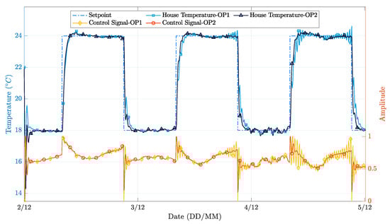 From a quantitative point of view, it is possible to observe that the PP controllers exhibit an MSE reduction of 42% and 52%, respectively, when compared with the on-off controller, while the PP-OP2 controller shows a 17% MSE reduction compared with the PP-OP1 controller. In this regard, it is important to recall that the additional computational effort implied by PP-OP2 is minimal and that the obtention of the additional variables can be realized with low-cost hardware, as discussed in Section 4.1. Moreover, in many cases, buildings already have systems that acquire these variables, and so, in such cases, the implementation cost would be negligible. The more relevant challenge in this latter case is that there are no standards to share these data, so the firmware would have to be adapted for each specific case.
