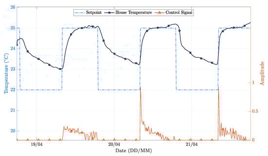 Focusing now on the PP controller, Figure 12 shows the room temperature variation and the control signal applied to the heating system related to the setpoint. The setpoint is tracked with a good accuracy. Once again, one observes that the indoor temperature never drops below 23 C because there is no assisted cooling system installed and the evaluation period covered external climate conditions typical of summer days (Figure 13).