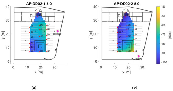 Radio maps for the two APs (a) AP-DDEG-1 and (b) AP-DDEG-2 on the ground floor of the library.