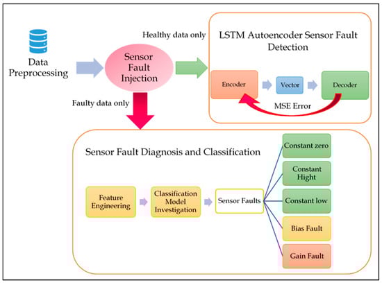 - The proposed method is applied into two entirely different experiments, with different data pre-processing, acquisition, and structuring; different DL algorithmic designs; and above all for detecting two different fault types—sensor faults and component faults. The methods proposed in the literature only focused on one fault type, either component faults or sensor faults. However, it was rarely seen that any work showed comprehension in detecting or diagnosing different fault types at once.
