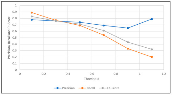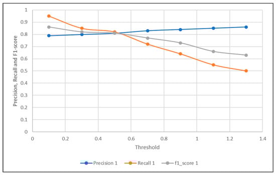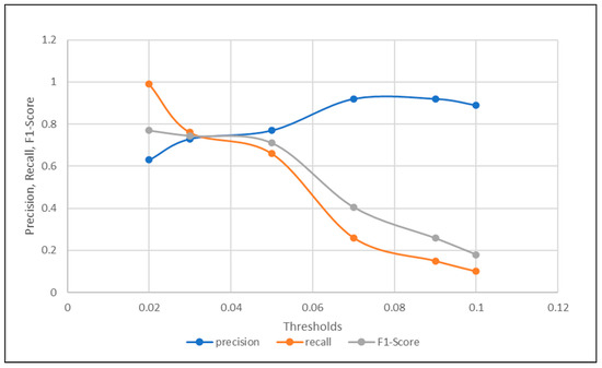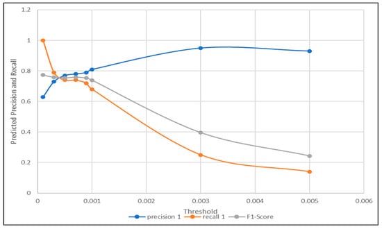 A pool of candidate threshold values was created, then the labels of the 4800 prediction samples were obtained based on each threshold in the pool, if the value of the signal difference was higher than the threshold a fault was considered to be detected, thus receiving a label 1, else label 0. The precision, recall, and f1-score were computed for each threshold in the pool, based on the generated labels and the original labels of the given prediction samples. When applying signal difference using the Pearson’s autocorrelation complement, the pool of chosen thresholds between the minimum and maximum observed values are shown in Table 5. Furthermore, for each chosen threshold, the accuracy, precision, recall, and f1-score were computed. Figure 6 illustrates the process of choosing the component fault detection threshold based on the precision, recall, and f1-score trade-off shown in the table below. As clearly shown in Figure 6, the selected threshold was the intersection between the three curves, which was approximately equal 0.0007 and the accuracy observed for this threshold value was 0.71.