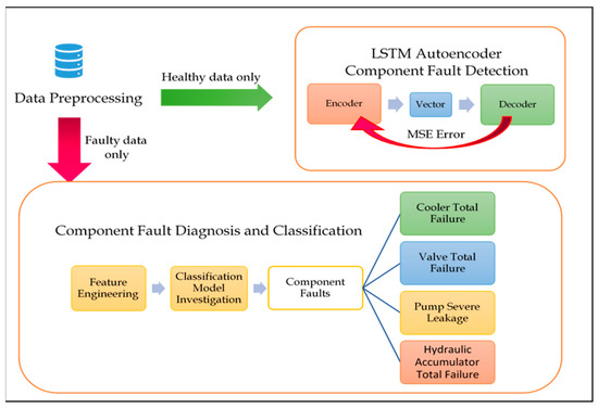 In this work, a comprehensive FDD approach for hydraulic systems is proposed. where an additional step is added in advance to the diagnosis, using the classification phase, to overcome the weaknesses of supervised diagnostic approaches in capturing rare and other faults existing beyond. To overcome this challenge, in this section the detection and diagnosis phases are performed separately. Where the detection phase is done by applying a Long Short-Term Memory (LSTM) [12] autoencoder to detect rare and unprecedented faults. This is followed by the diagnosis phase, which uses the ML and DL classifiers to analyze the nature of the captured faults in phase one.