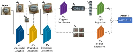 Our pipeline takes a watermeter image I as input and then it outputs the corresponding watermeter value. First, the watermeter detection model detects the position of the watermeter and then obtain the cropped watermeter image . Second, we adopt the orientation alignment module to rotate ; this is followed by component localization with component detection module , leading to one bounding box for the digit box and the four bounding boxes for pointer meters. Then, we design the keypoint localization model to localize and separate each digit in . Finally, we can read the values and by the digit reading model and the pointer reading model , respectively. The final prediction V is the sum of and .