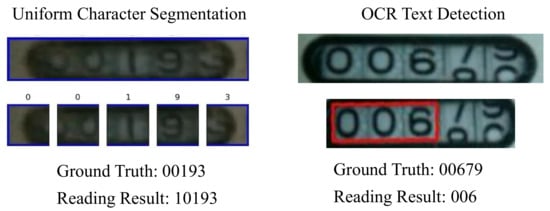 Uniform character segmentation and character detection. The segmentation result on the left is inaccurate, and the digits on the right are not fully detected; both lead to wrong readings.