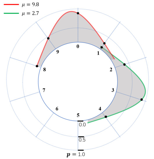 After keypoint localization, we crop the digit box images into five parts according to regressed coordinates. For the ground truth of 9.5, as shown in the far-right digit in Figure 6, the digit appeared as the bottom half of 9 and the top half of 0. A straightforward way to predict the digit value is to regress the value between [0,10) by using Mean Square Error(MSE). But the penalty is different when the model output 0.0 and 9.0 with MSE loss (), which will provide the wrong update information to the model. This situation is caused by the value jump from 9 to 0. To eliminate this effect, we formulate this task as a Circle Probability Distribution (CPD) prediction problem. Specifically, as shown in Figure 7, we use a Gaussian distribution to calculate probabilities for every discrete integer (ranging from 0 to 9 by step size of 1). Given as the ground truth, we set in our experiment, and the optimal model should predict a Gaussian CPD centered at .