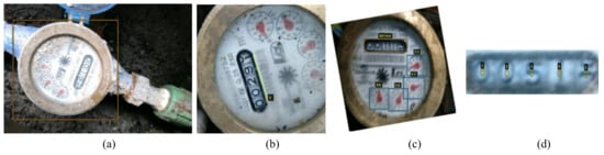 As shown in Figure 3, six models need to be trained in our system, and they are executed sequentially. The latter model depends on the previously trained model. Therefore, we annotate our training data progressively. As shown in Figure 8a, we first annotate the position of the watermeter at the original collected images. Model is trained on these annotated images, and the trained model is used to detect watermeter on all original images. Detected watermeters are cropped out, and we can obtain images like Figure 8b. Secondly, we annotate the line segment with direction at cropped watermeter. Then, we calculate the angle based on the annotated line segment and then use the and values of the angle to supervise the training of . Trained is then used to correct the orientation of all training data. Thirdly, we annotate the bounding boxes and actual values of digits and pointers, as shown in Figure 8c. With annotated position supervision, we train another detection model . Trained is then used to crop out digits and pointers. Finally, is trained with cropped pointer image and annotated value. is trained with cropped digits image and annotated digit value. Furthermore, five-digit center points in the digit box, as shown in Figure 8d, are annotated to guide the center localization.