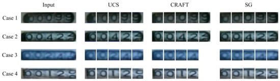 We determine that is able to identify the position of the digit box with high precision. Therefore, we directly utilize the uniform character segmentation method to divide each digit. After testing, however, we found that if the position identified by is not accurate, the segmentation result will be poor (Figure 10 Case 1 and Case 2 in the second column). Therefore, to decouple the digital positioning from the previous step, we utilize the OCR text detector CRAFT [41] to detect each digit. CRAFT is not accurate enough, however, when identifying a rolling digit (Figure 10 Case 3 and Case 4 in the third column). We thus propose the use of spatial guidance before solving this problem. The visual comparison of these methods are shown in Figure 10.