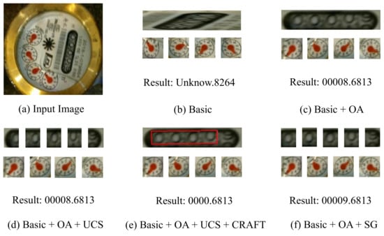 A visual comparison is provided in Figure 11. Basic reading failed because the reading is conducted at the wrong orientation (Figure 11b). UCS may have segmented incorrectly, resulting in erroneous readings (Figure 11d). Meanwhile, CRAFT may have made incomplete detections, resulting in incorrect readings (Figure 11e). OA could provide the correct angle for the reading (Figure 11c) and SG accurately segment the digits in the digit box (Figure 11f); notably, their aggregation could generate high-quality reading results.