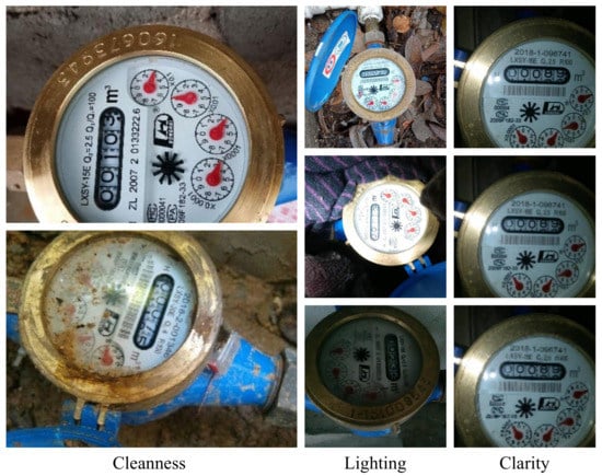 Both types of smart readers methods described above require high switching costs. Despite the existence of smart readers, they are not widespread in many countries, especially in the underdeveloped ones, and it is still manually read on site by the operator who uses the image as proof of reading. Moreover, since there are many images to be evaluated, the traditional manual reading of the watermeter is tedious and error-prone. To address this dilemma, we propose taking a photo with a mobile phone and automatically analyzing the watermeter reading in this image. Because of the diversity of imaging conditions, especially the potentially challenging environments where the watermeters reside, it is not a trivial work to develop a robust automatic reading system for watermeters. As shown in Figure 1, real images of watermeters come with a variety of challenges. First, the lighting, resolution, and background environment varies across images. Second, the position and rotation angle of the watermeter is unpredictable. Finally, the watermeter is usually covered with dust, and the resolution of the image is low, making it tough to accurately read the watermeter value.