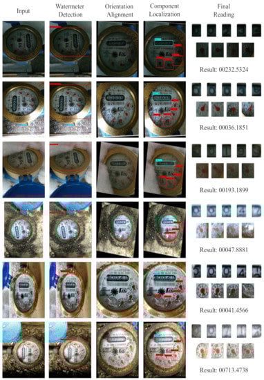 Experimental results show that our proposed pipeline has the lowest error rate in various environments. Figure 13 shows some of these results: these watermeters had different angles and perspectives; some watermeters were located in dark or light-reflective environments and some watermeters were blurry and covered with dust. Under these various challenging environments, our method achieved satisfactory results.