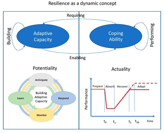 The definitions and conceptualizations of resilience present in literature such as [12,13,14,15] can be roughly clustered into two views: (1) resilience as a performative property derived by the system ability to cope with changing conditions; and (2) resilience as an emerging property derived by the system adaptive capacity.